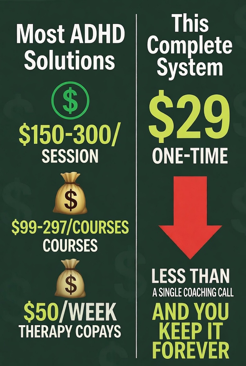 💡 Real talk: Most ADHD "solutions" ask for $150-300/session for coaching, $99-297 for courses, or $50/week for therapy copays.