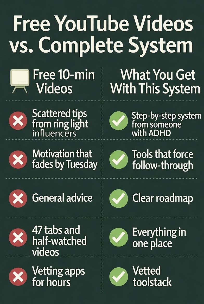None of this exists in one place on YouTube. And definitely not designed like this for ADHD brains, by someone who gets it.